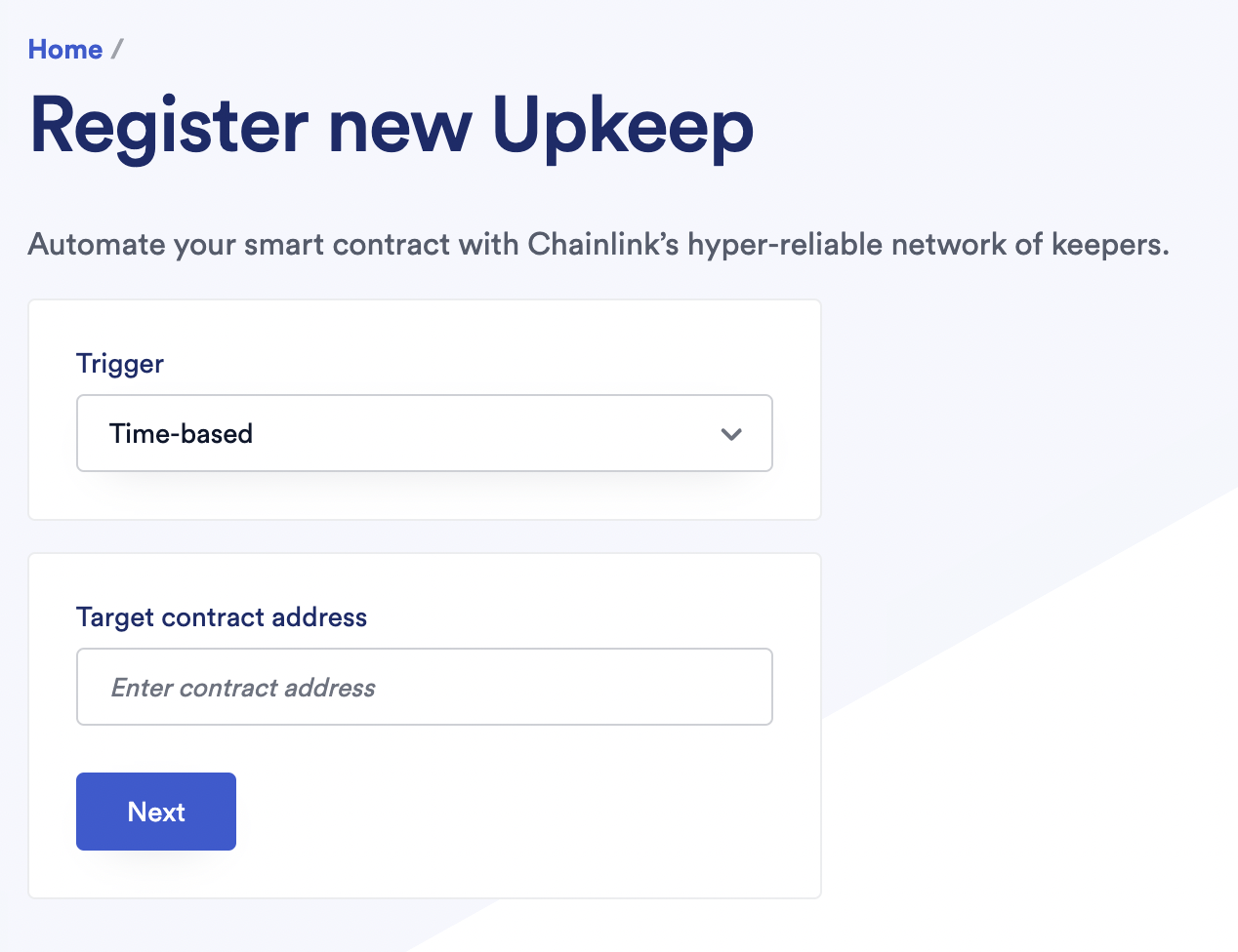 When you select the time-based trigger, you are prompted to enter a contract address. Provide the address of the contract you want to automate. If you did not verify the contract on chain, you will need to paste the Application Binary Interface (ABI) of the deployed contract into the corresponding text box. Select the function name that you want to execute and provide any static inputs. If you want to use dynamic inputs please see Custom logic Upkeeps